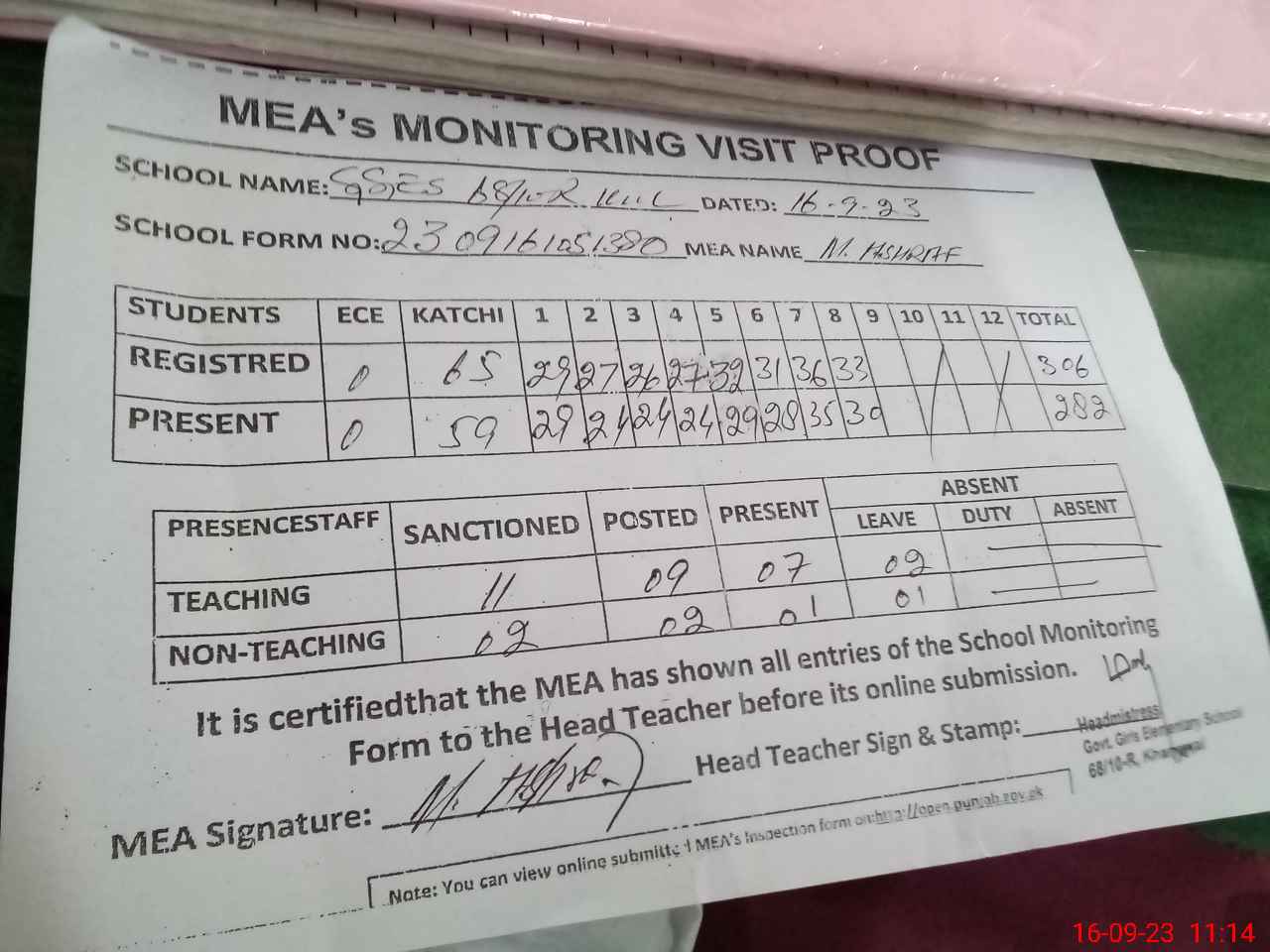 | Attendance Register | Head Teacher | MEA with School | Visit Proof |