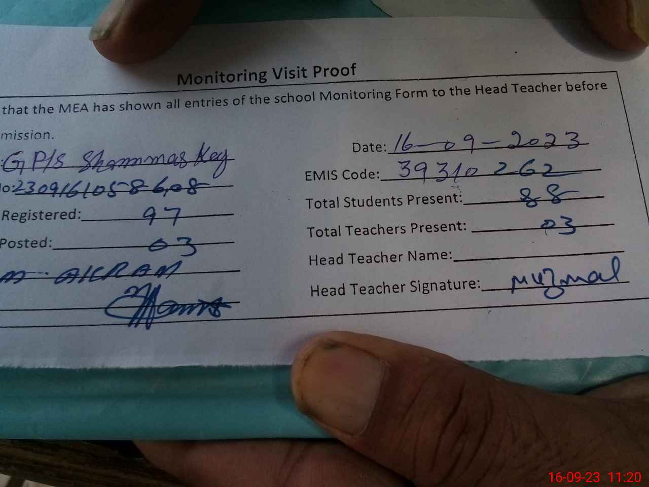 | Attendance Register | Head Teacher | MEA with School | Visit Proof |