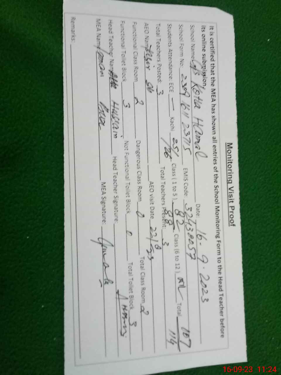 | Attendance Register | Head Teacher | MEA with School | Visit Proof |