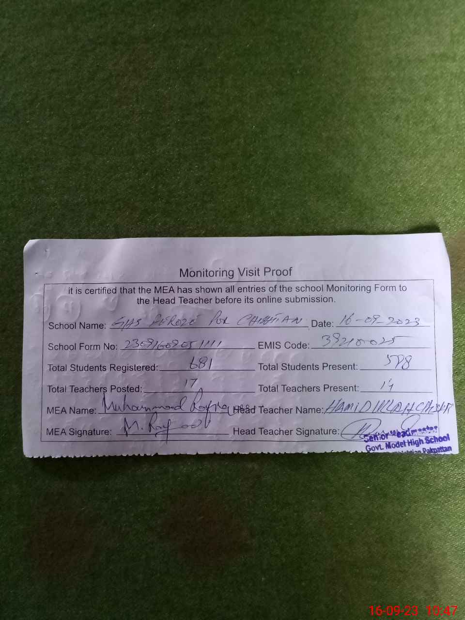 | Certified that this School was Inspected by the Undersigned MEA/DMO Today and the Information Stated Above is as Per Record. | |||||