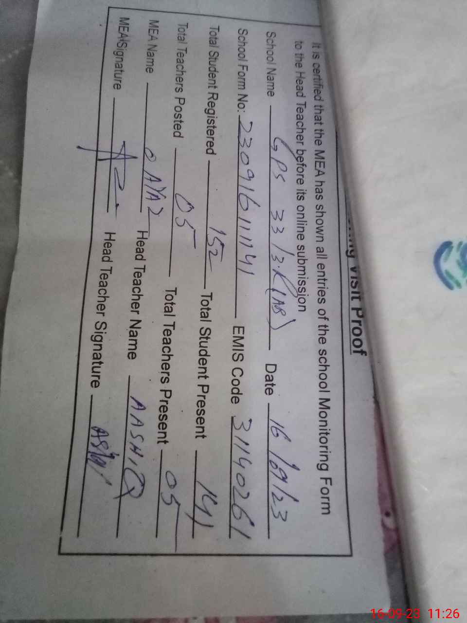 | EMIS Code: 31140261 | Name of School: GPS CHAK NO.33/3-R AB | |||