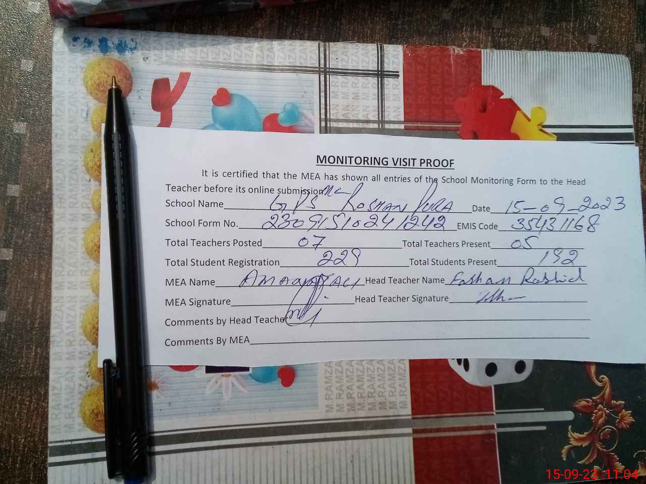 | Attendance Register | Head Teacher | MEA with School | Visit Proof |