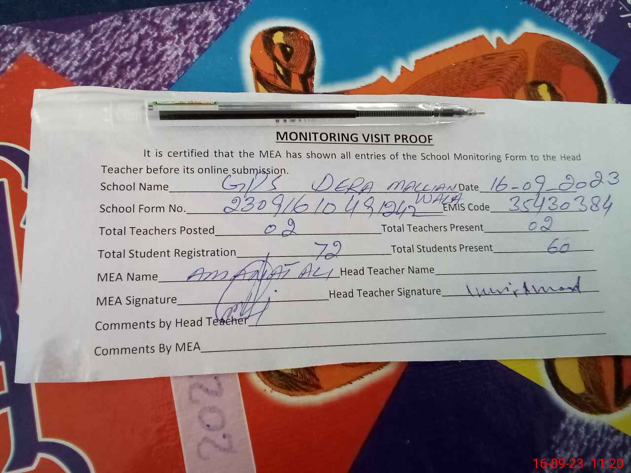| Attendance Register | Head Teacher | MEA with School | Visit Proof |