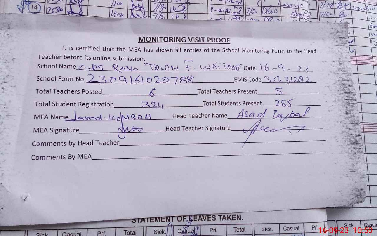 | Attendance Register | Head Teacher | MEA with School | Visit Proof |