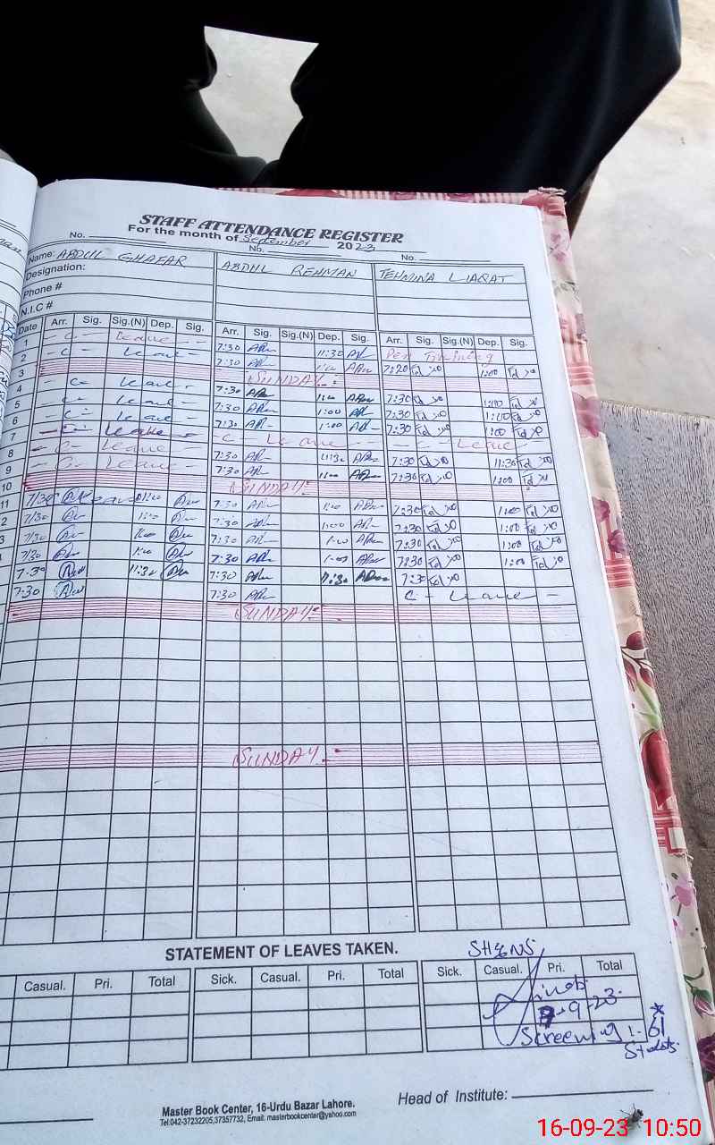 | CNIC | Full Name | Designation | R/C | Absence During Last Calender Month |