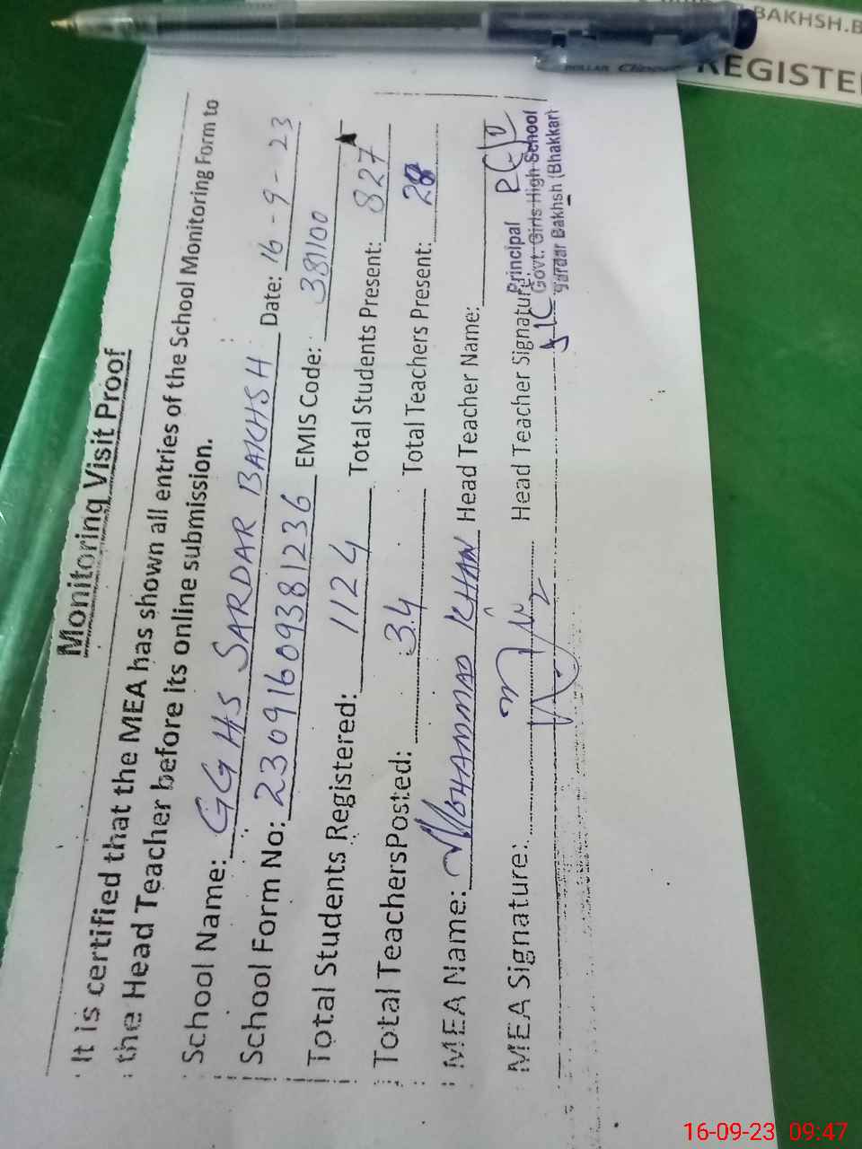 | EMIS Code: 38110067 | Name of School: GGHS SARDAR BAKHSH | |||