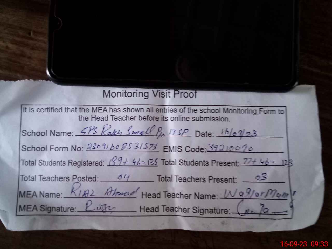 | Attendance Register | Head Teacher | MEA with School | Visit Proof |