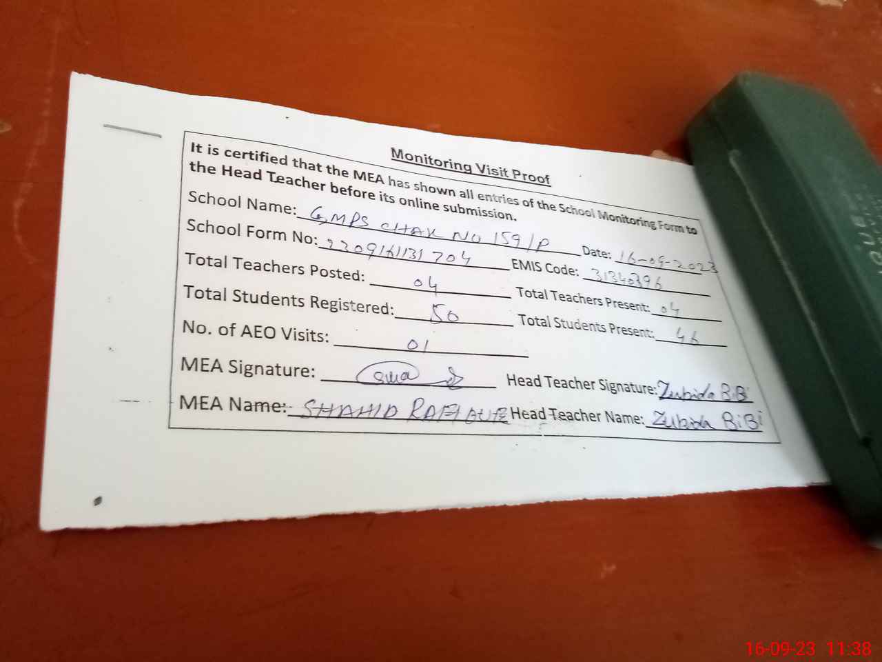 | Attendance Register | Head Teacher | MEA with School | Visit Proof |
