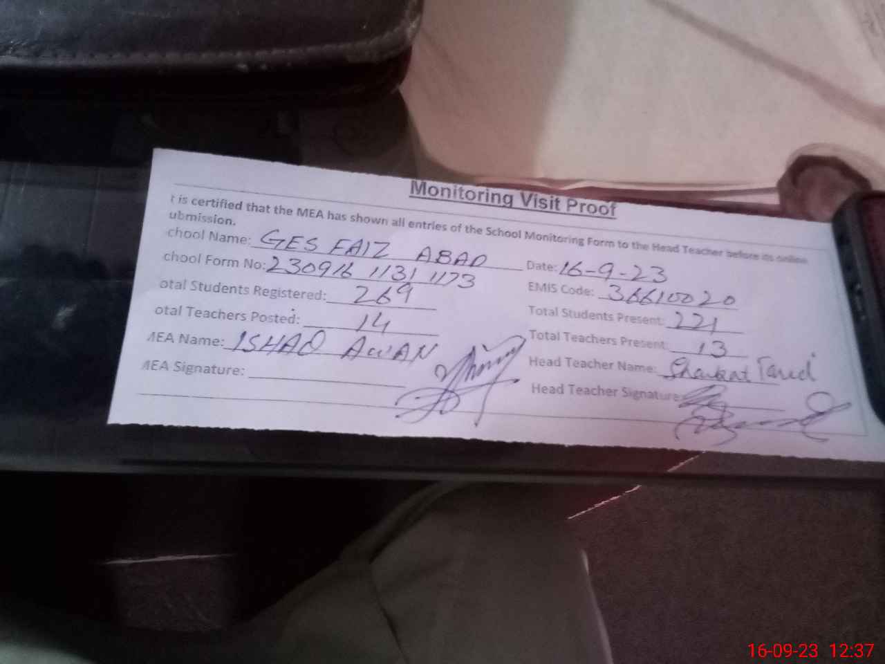 | Attendance Register | Head Teacher | MEA with School | Visit Proof |
