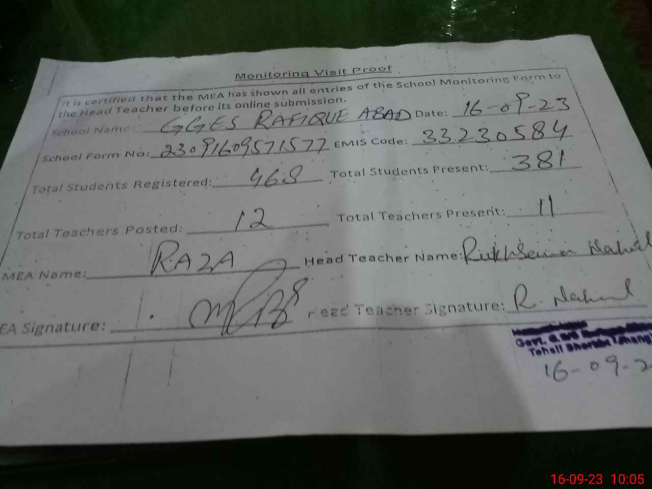 | Monitoring Date: 16-09-2023 | Start Time: 16-09-2023 09:27 AM | End Time: 16-09-2023 10:05 AM | Name of MEA: S-**** MU**** RA**** | |