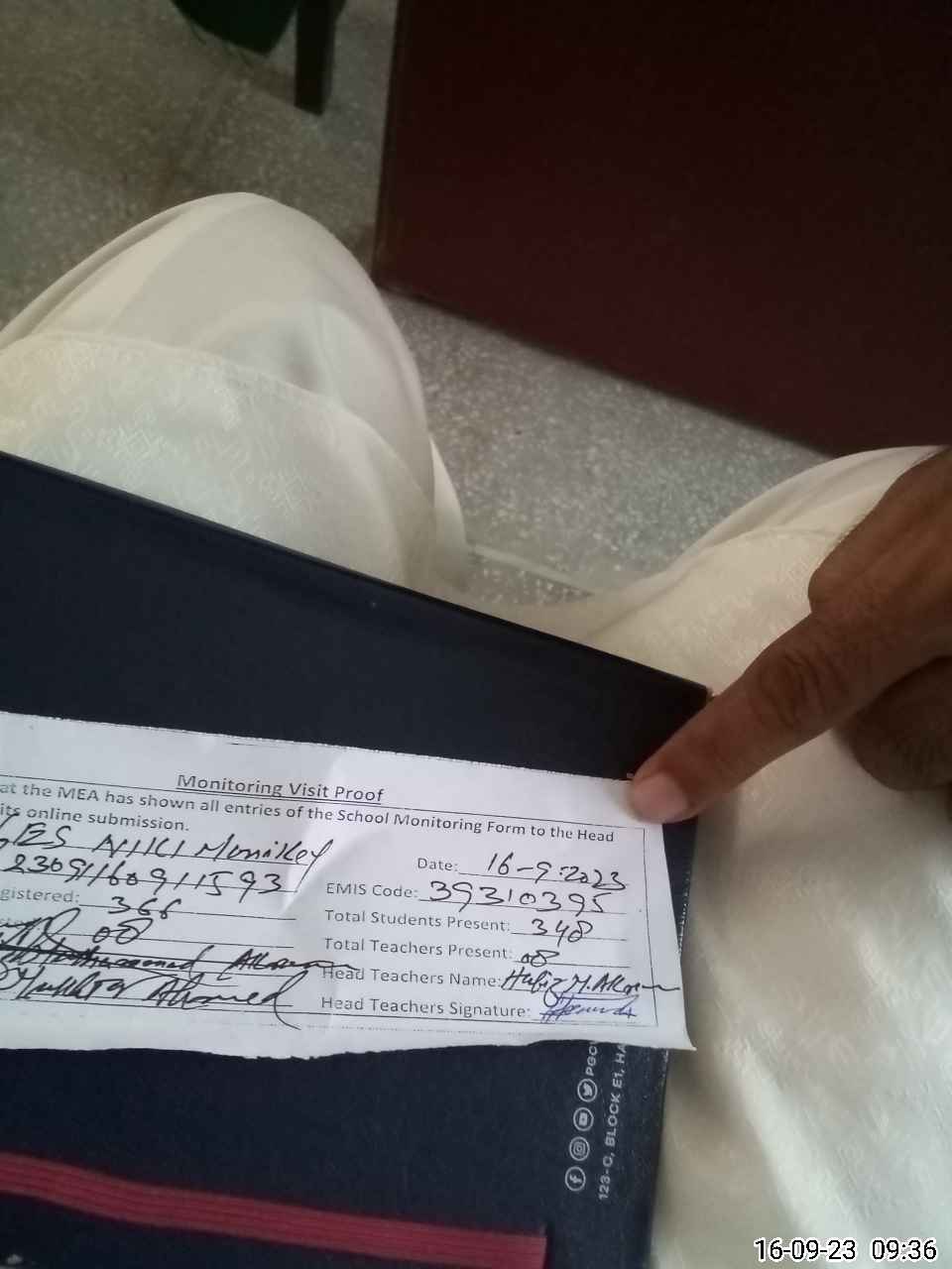 | Attendance Register | Head Teacher | MEA with School | Visit Proof |