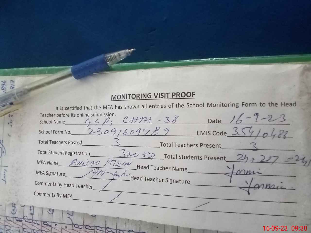 | Attendance Register | Head Teacher | MEA with School | Visit Proof |