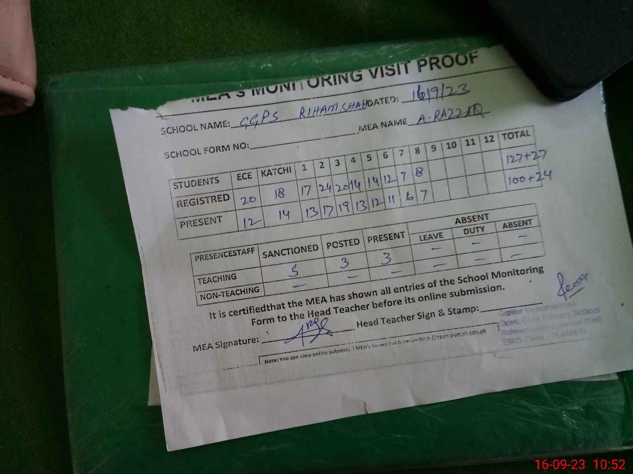 | Attendance Register | Head Teacher | MEA with School | Visit Proof |