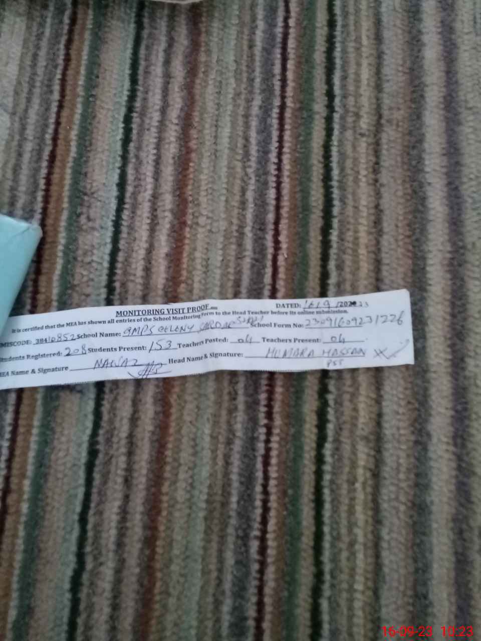 | Attendance Register | Head Teacher | MEA with School | Visit Proof |