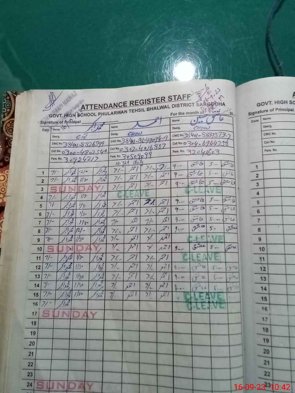 | CNIC | Full Name | Designation | R/C | Absence during last cal. month |