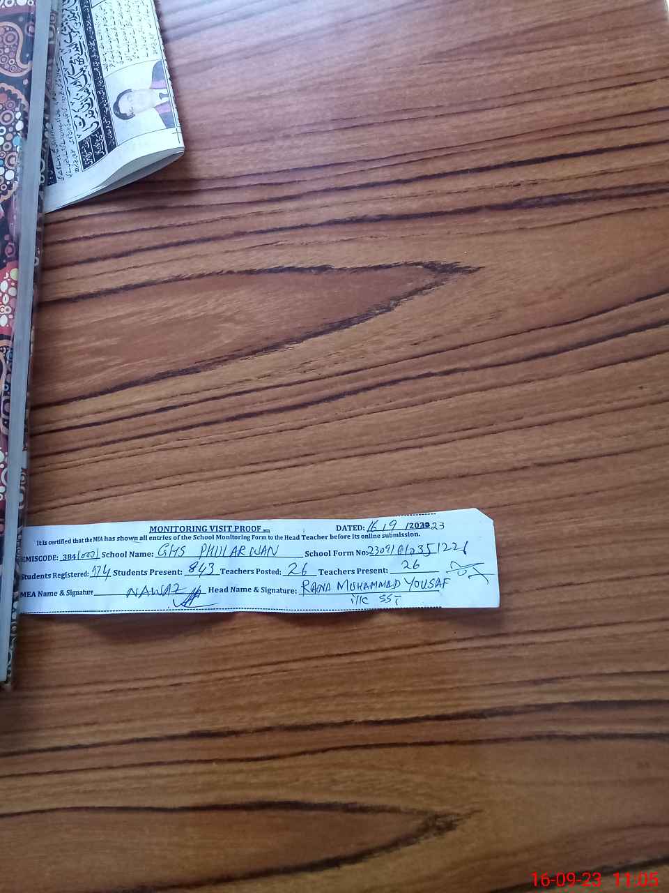 | Attendance Register | Head Teacher | MEA with School | Visit Proof |