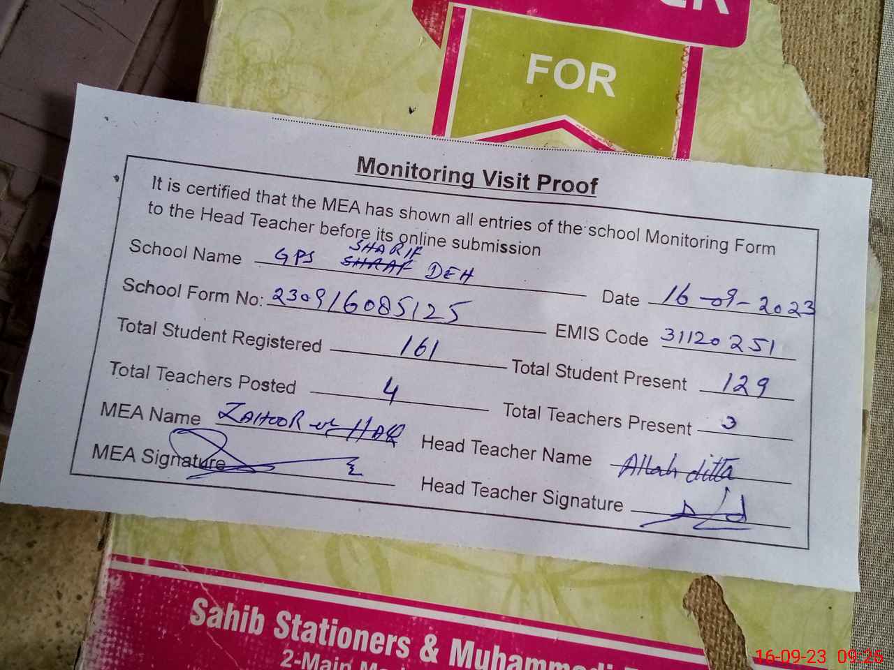 | Attendance Register | Head Teacher | MEA with School | Visit Proof |