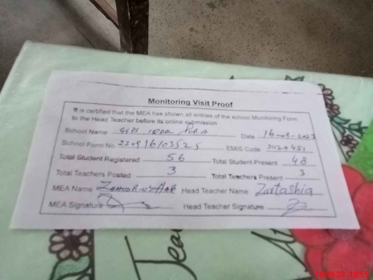| Attendance Register | Head Teacher | MEA with School | Visit Proof |