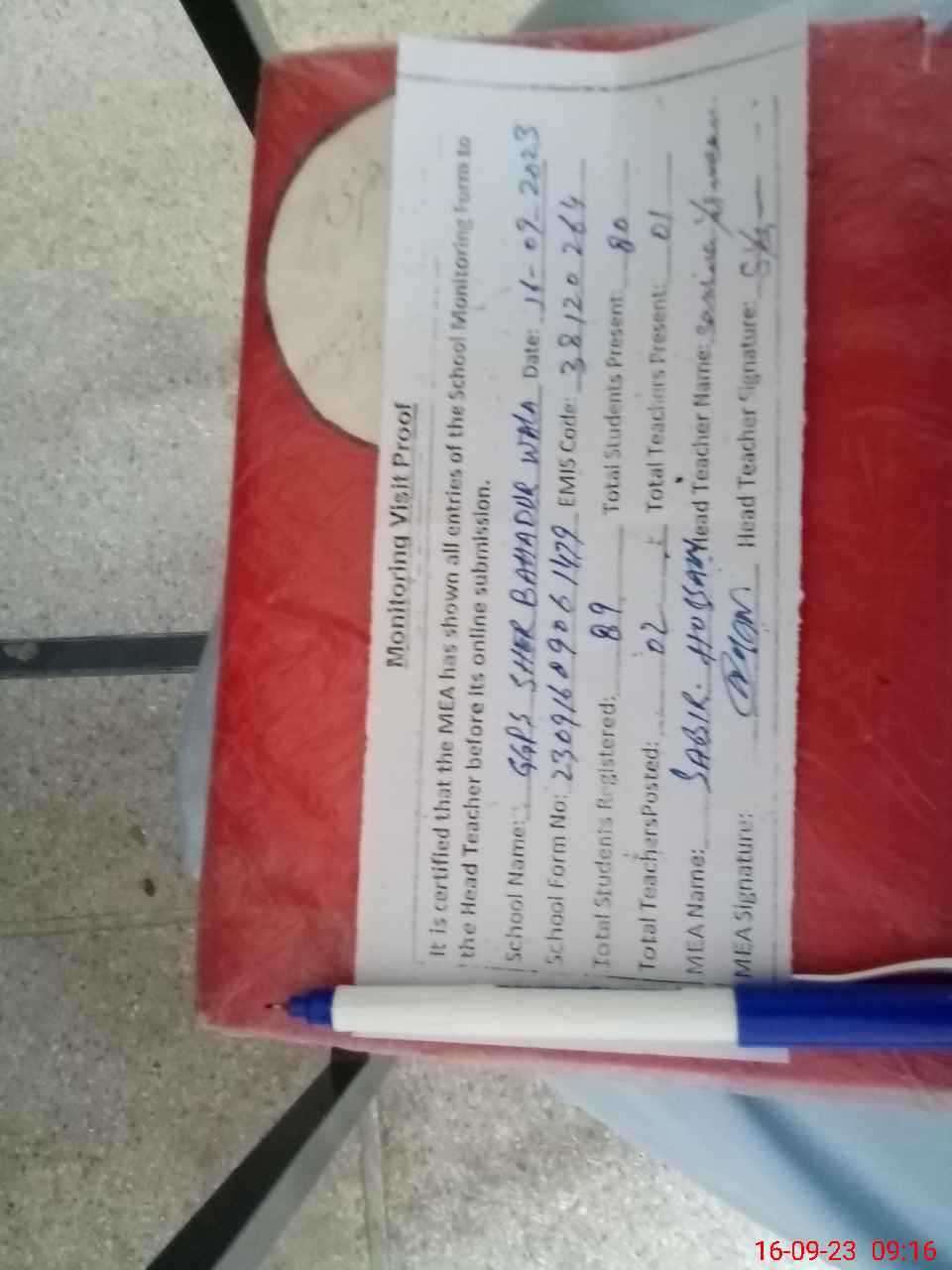 | Attendance Register | Head Teacher | MEA with School | Visit Proof |