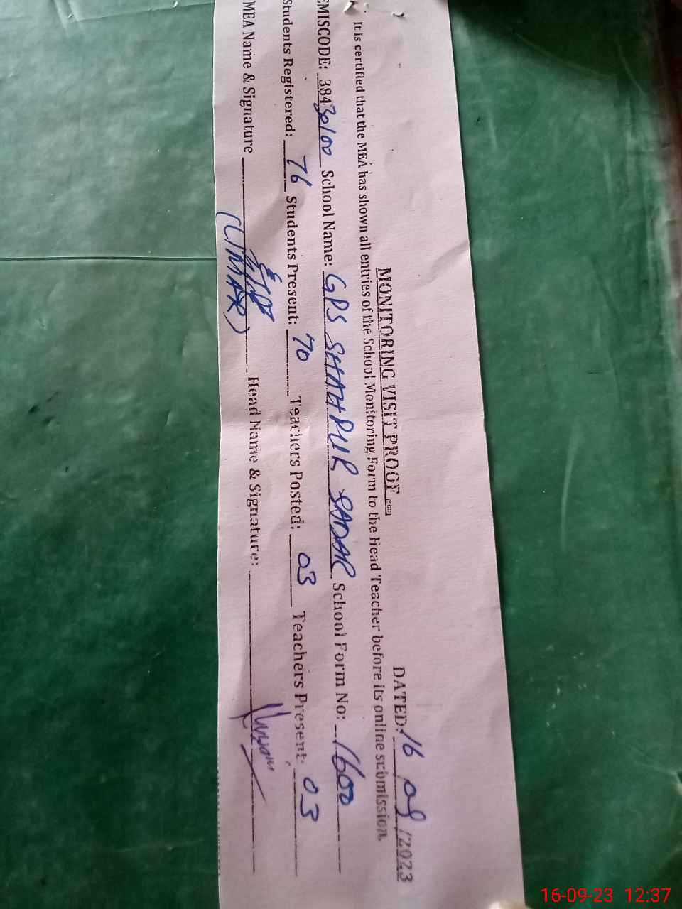 | Attendance Register | Head Teacher | MEA with School | Visit Proof |