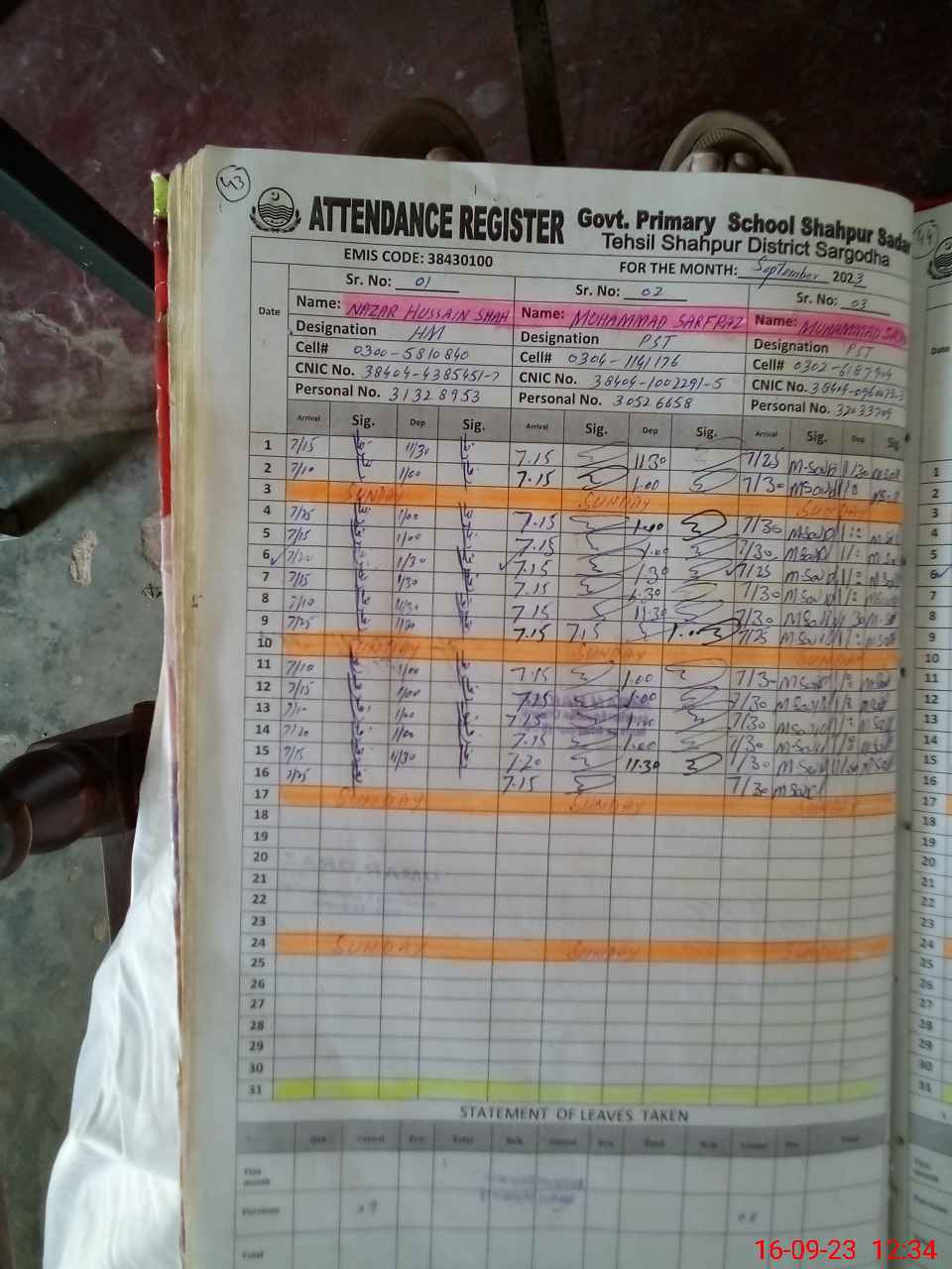 | Name: NA**** HU**** SH**** Designation: (School Headmaster's/Headmistress's) PST Phone/Cell Number: 03**** |