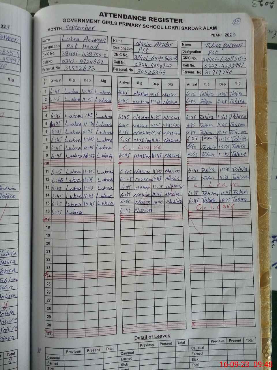 | CNIC | Full Name | Designation | R/C | Absence During Last Calender Month |