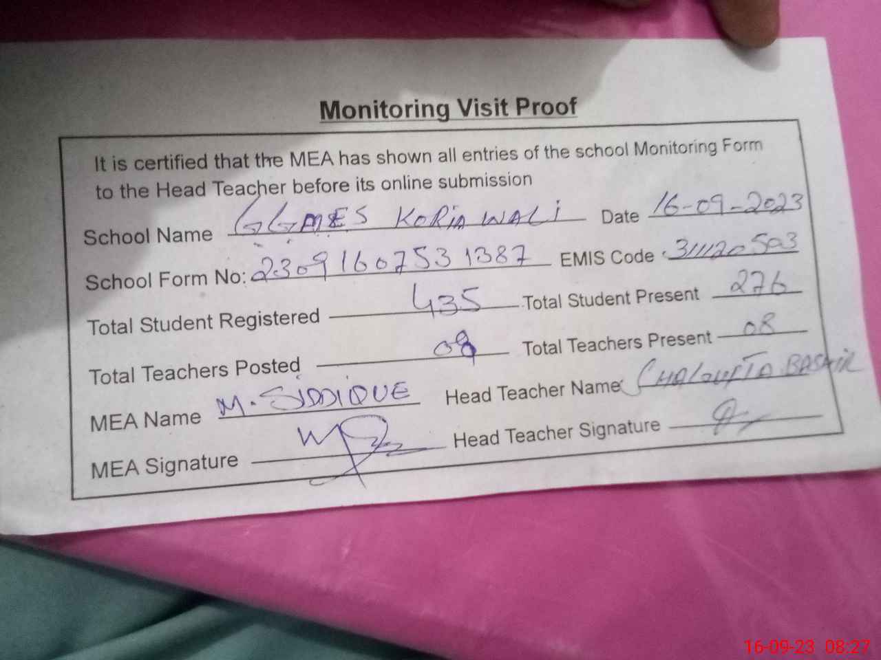 | Attendance Register | Head Teacher | MEA with School | Visit Proof |