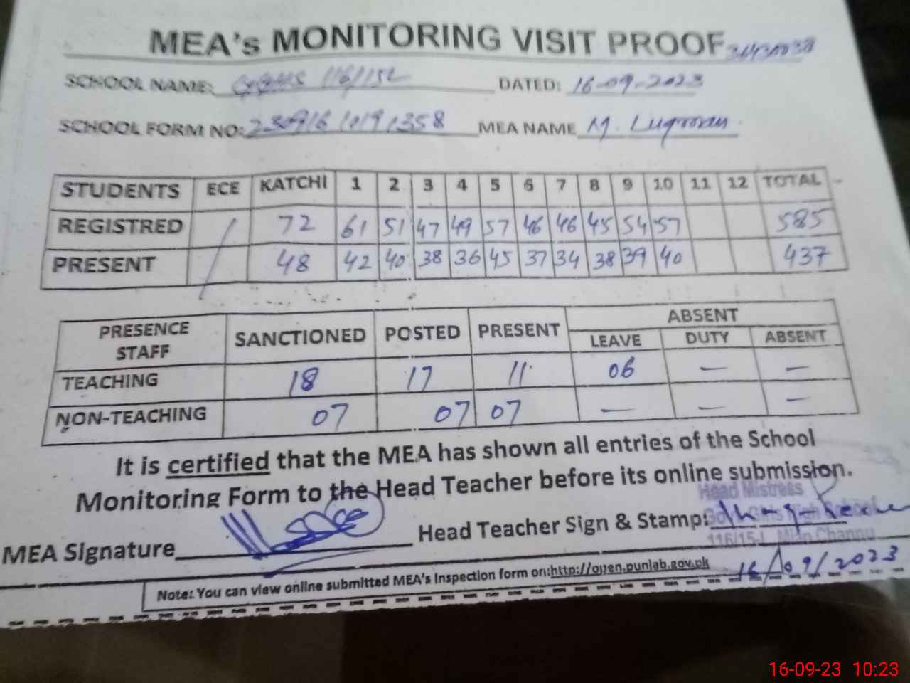 | EMIS Code: 36430038 | Name of School: GGHS 116/15-L, MIAN CHANNU | |||