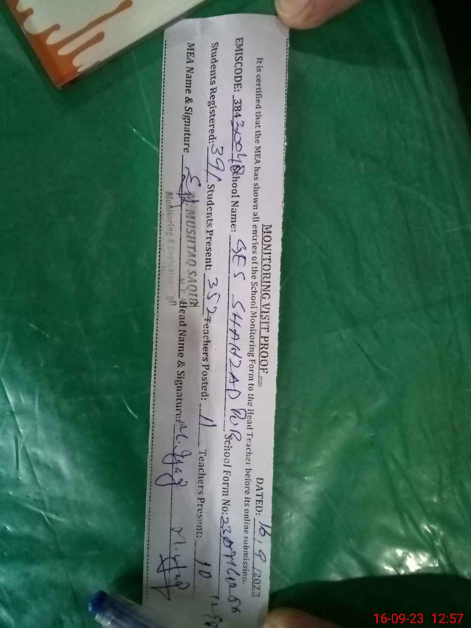 | Attendance Register | Head Teacher | MEA with School | Visit Proof |
