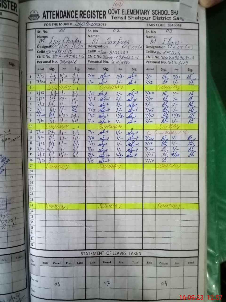 | CNIC | Full Name | Designation | R/C | Absence during last cal. month |