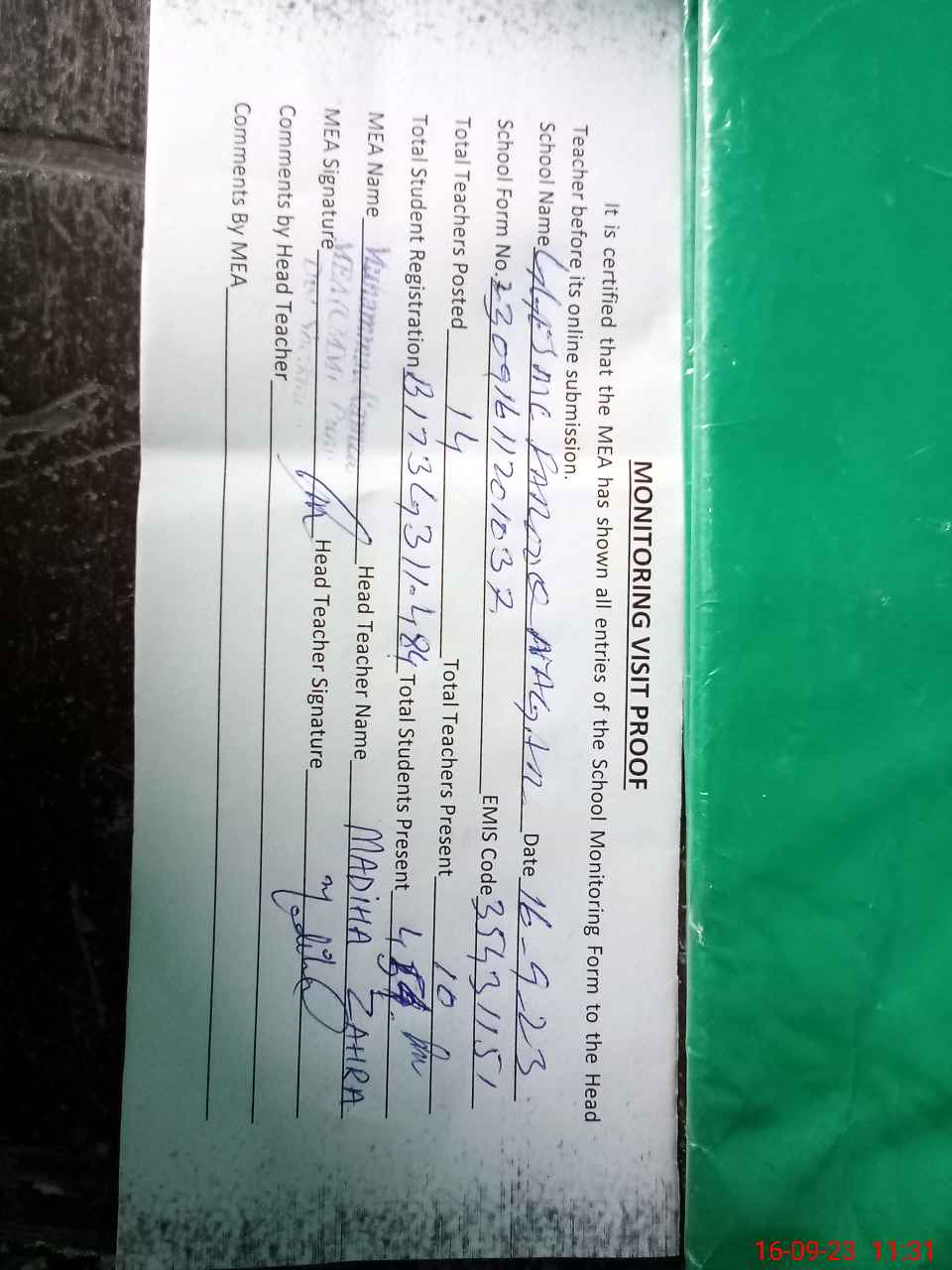 | Attendance Register | Head Teacher | MEA with School | Visit Proof |