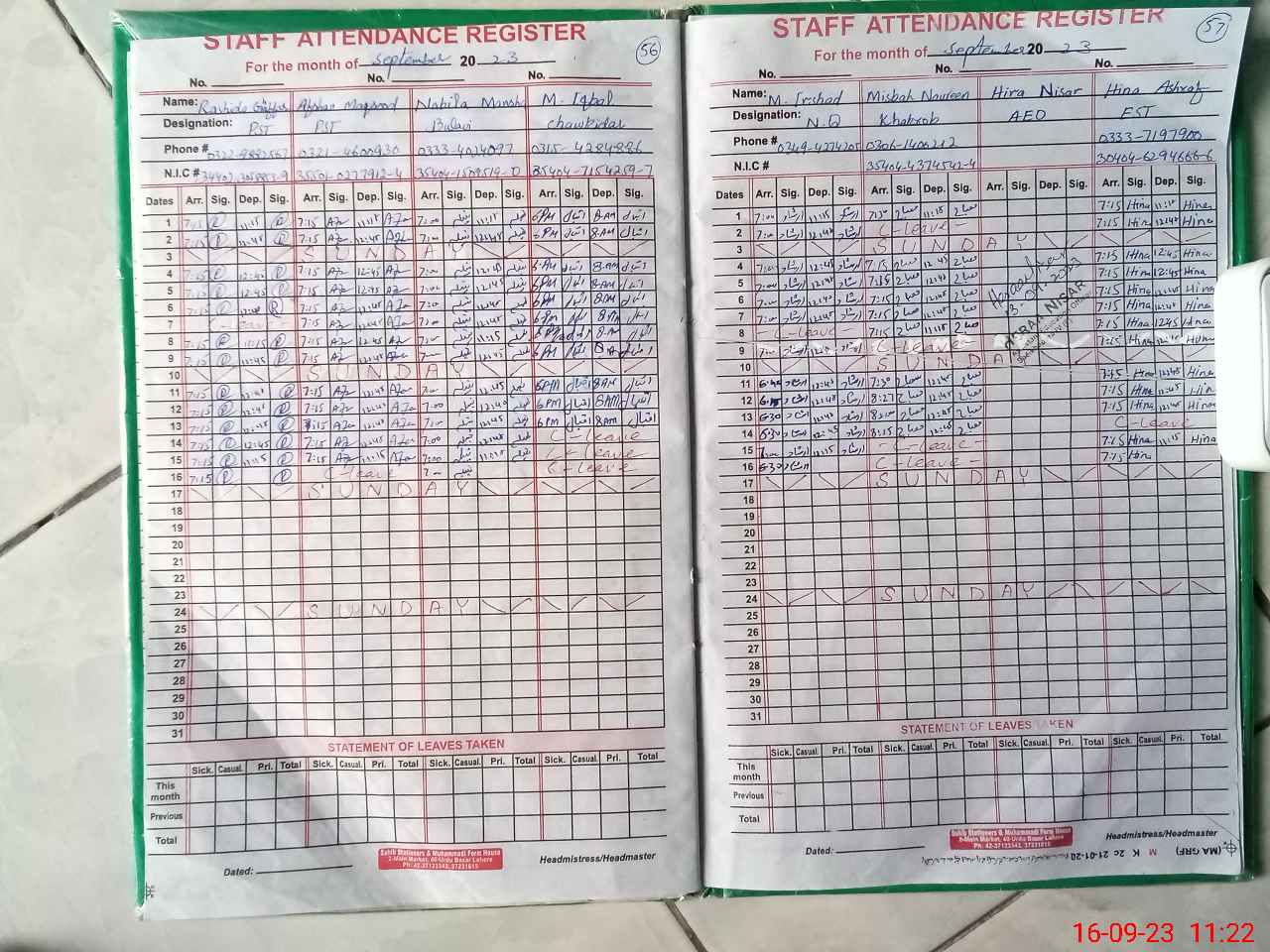 | CNIC | Full Name | Designation | R/C | Absence During Last Calender Month |