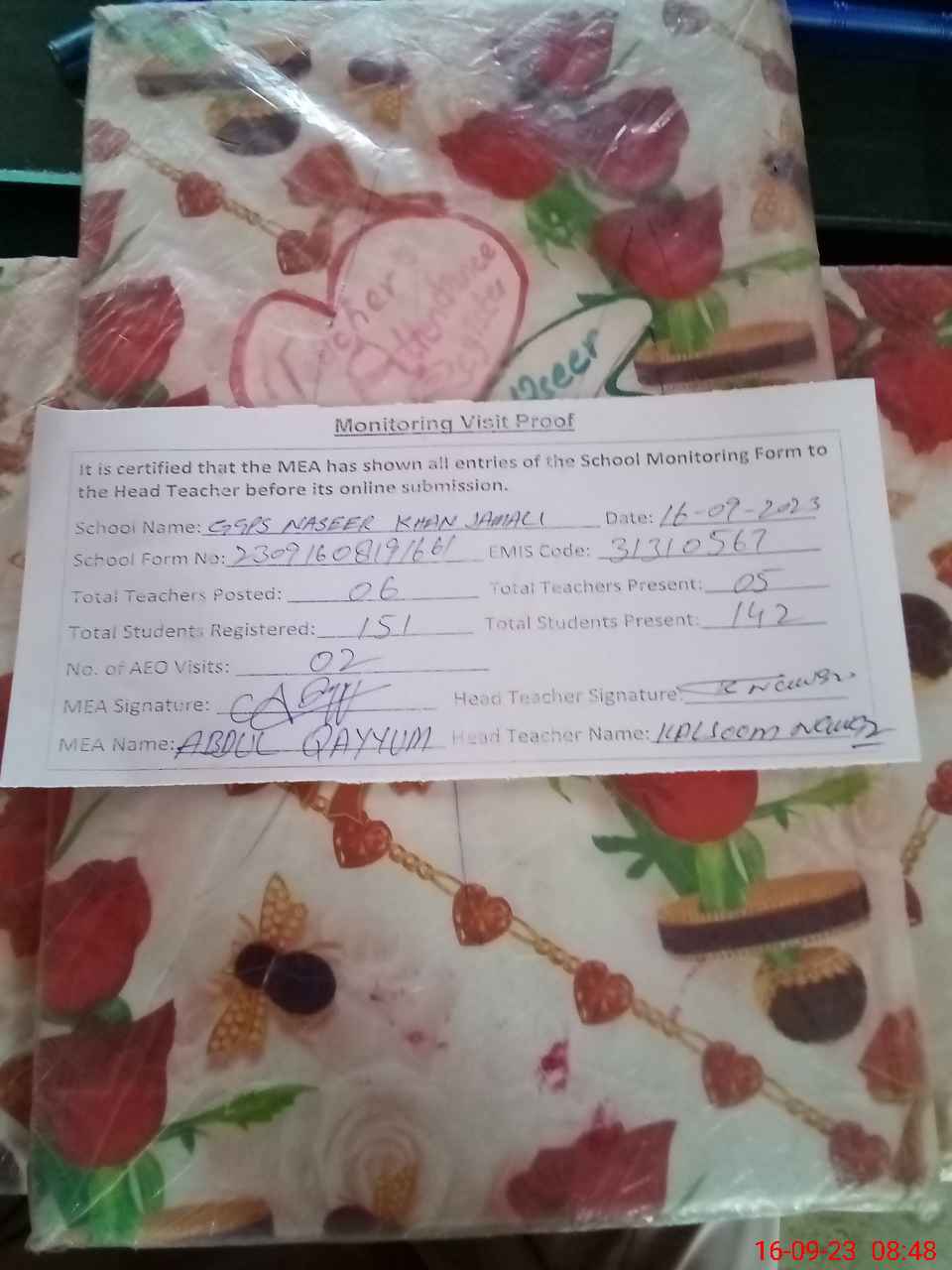 | Attendance Register | Head Teacher | MEA with School | Visit Proof |