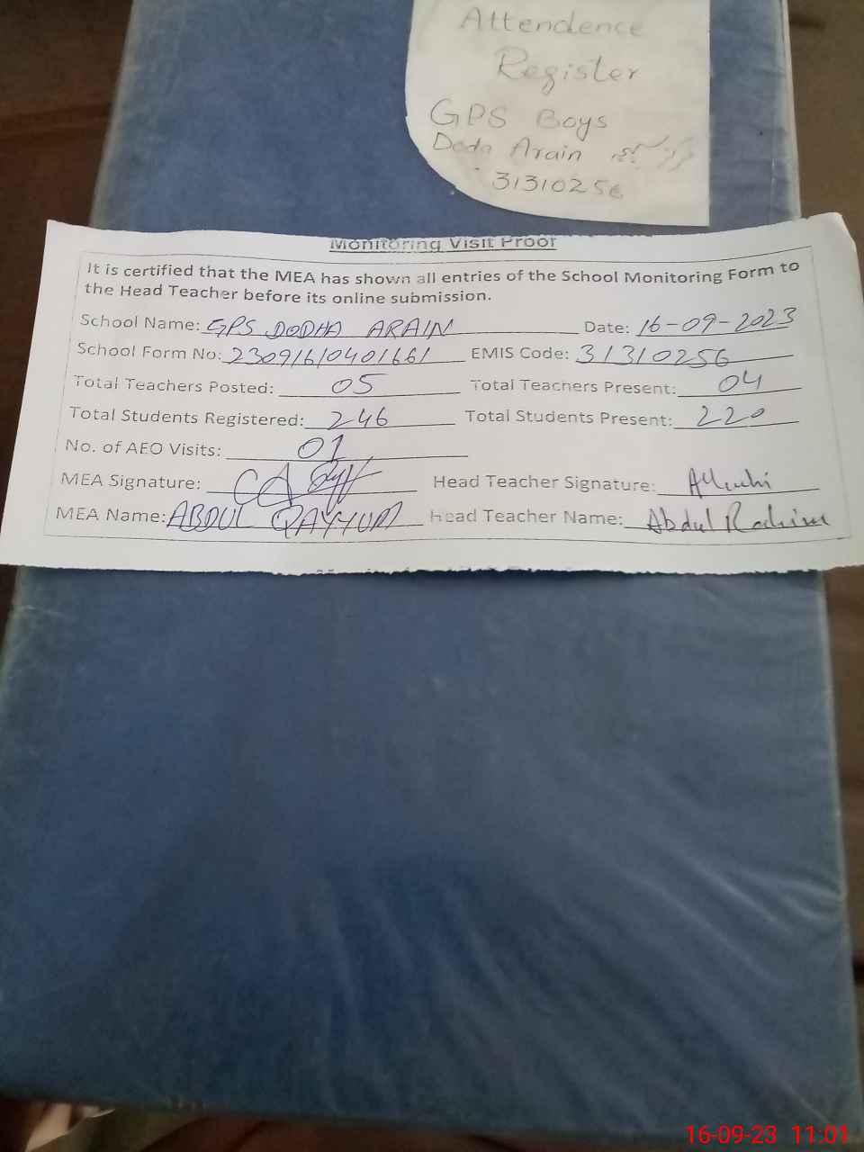 | Attendance Register | Head Teacher | MEA with School | Visit Proof |