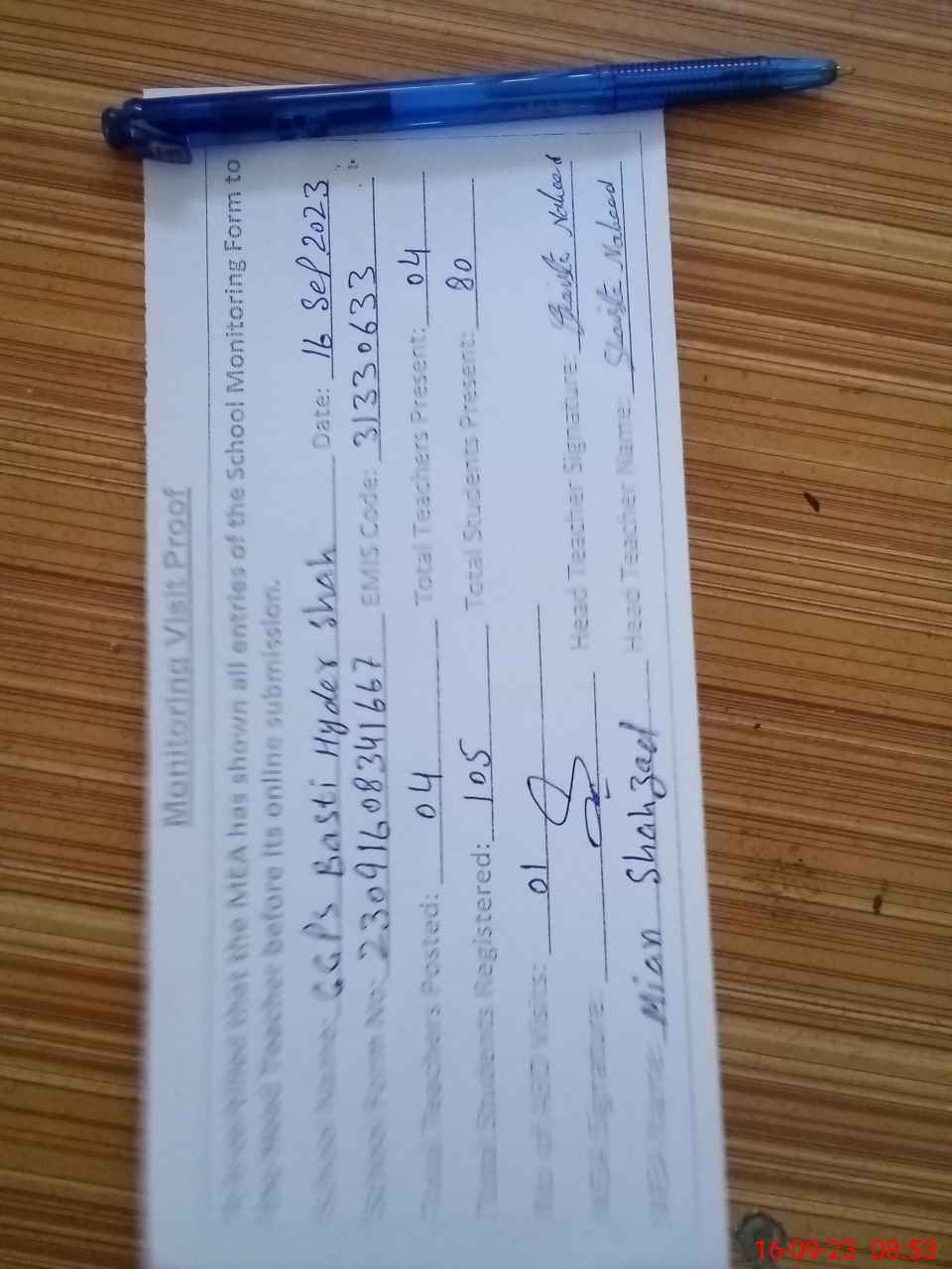 | Attendance Register | Head Teacher | MEA with School | Visit Proof |