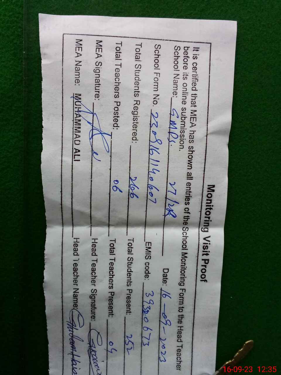 | Certified that this School was Inspected by the Undersigned MEA/DMO Today and the Information Stated Above is as Per Record. | |||||