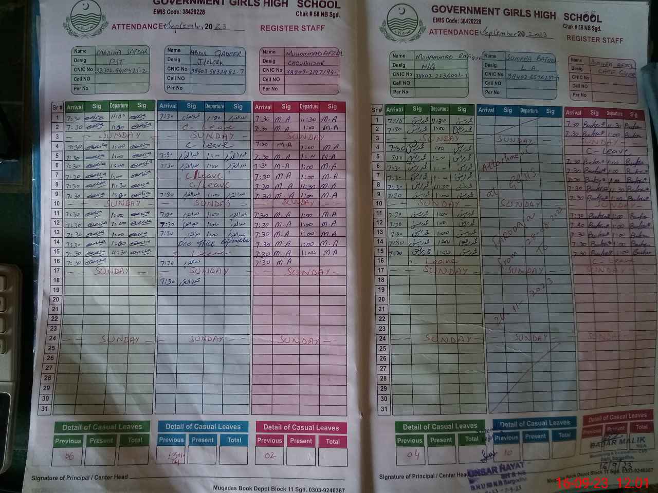 | CNIC | Full Name | Designation | R/C | Absence During Last Calender Month |