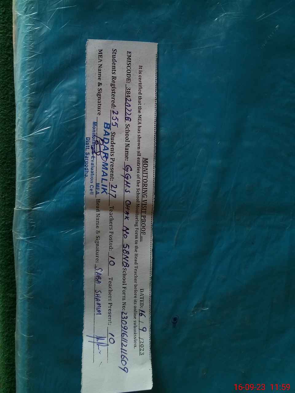 | Name: SA**** SH**** Designation: (School Headmaster's/Headmistress's) SST I/C HEADMISTRESS Phone/Cell Number: 03**** |