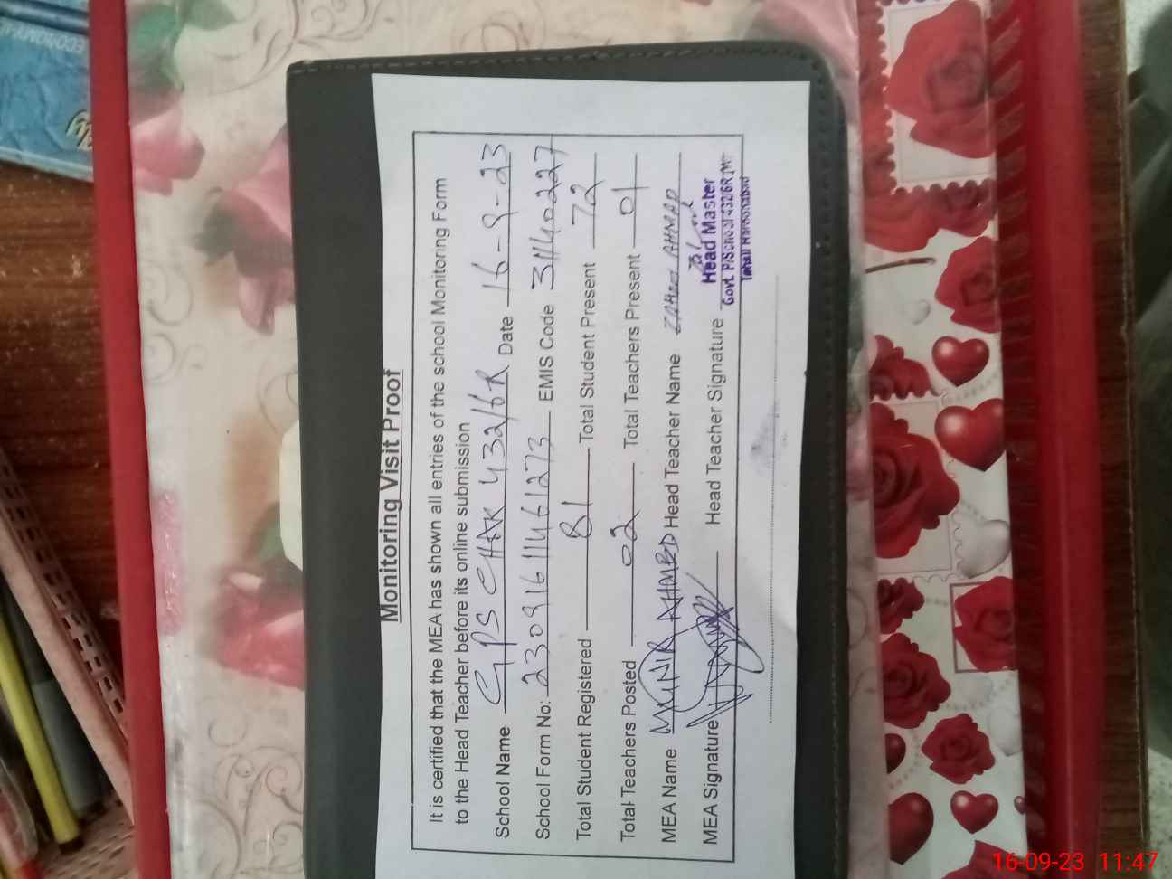 | Attendance Register | Head Teacher | MEA with School | Visit Proof |