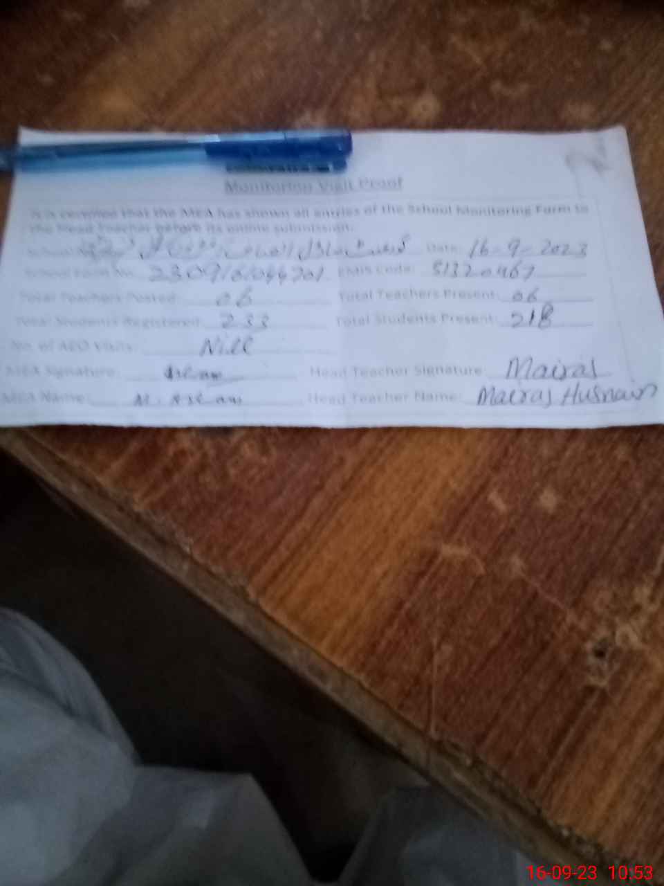| Attendance Register | Head Teacher | MEA with School | Visit Proof |