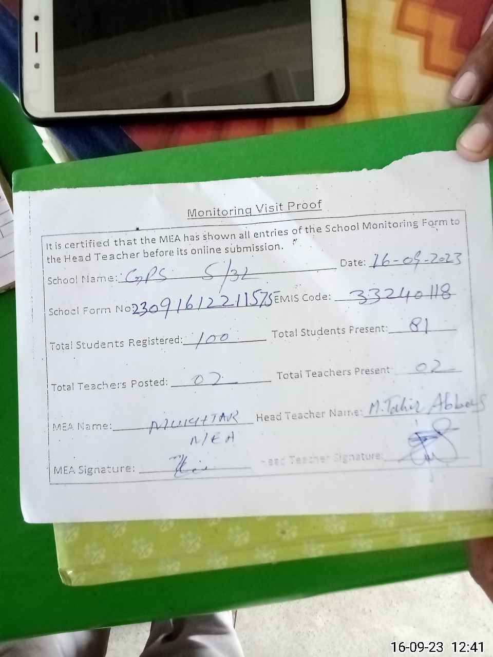 | Attendance Register | Head Teacher | MEA with School | Visit Proof |