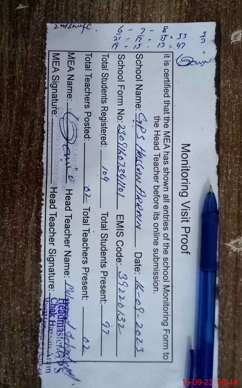 | EMIS Code: 39220132 | Name of School: GPS CHAK HASSAN ARRAIN | |||
