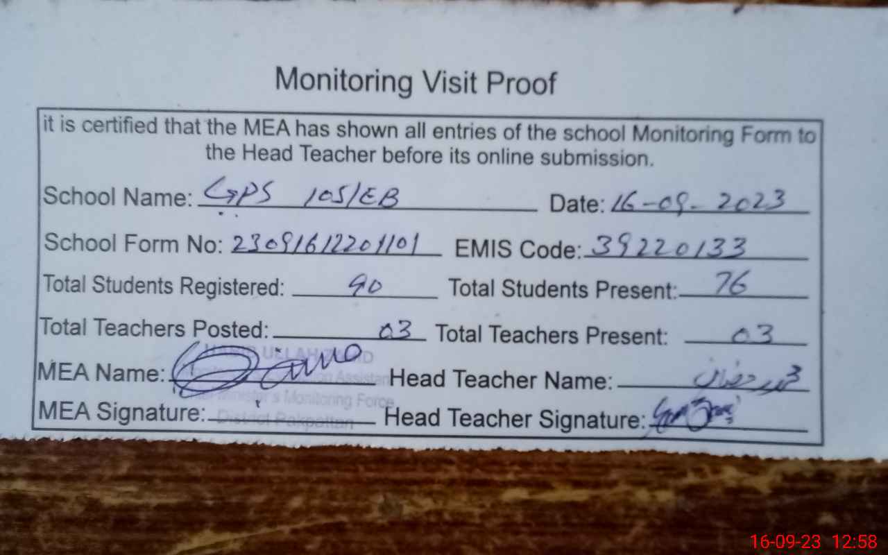 | Certified that this School was Inspected by the Undersigned MEA/DMO Today and the Information Stated Above is as Per Record. | |||||