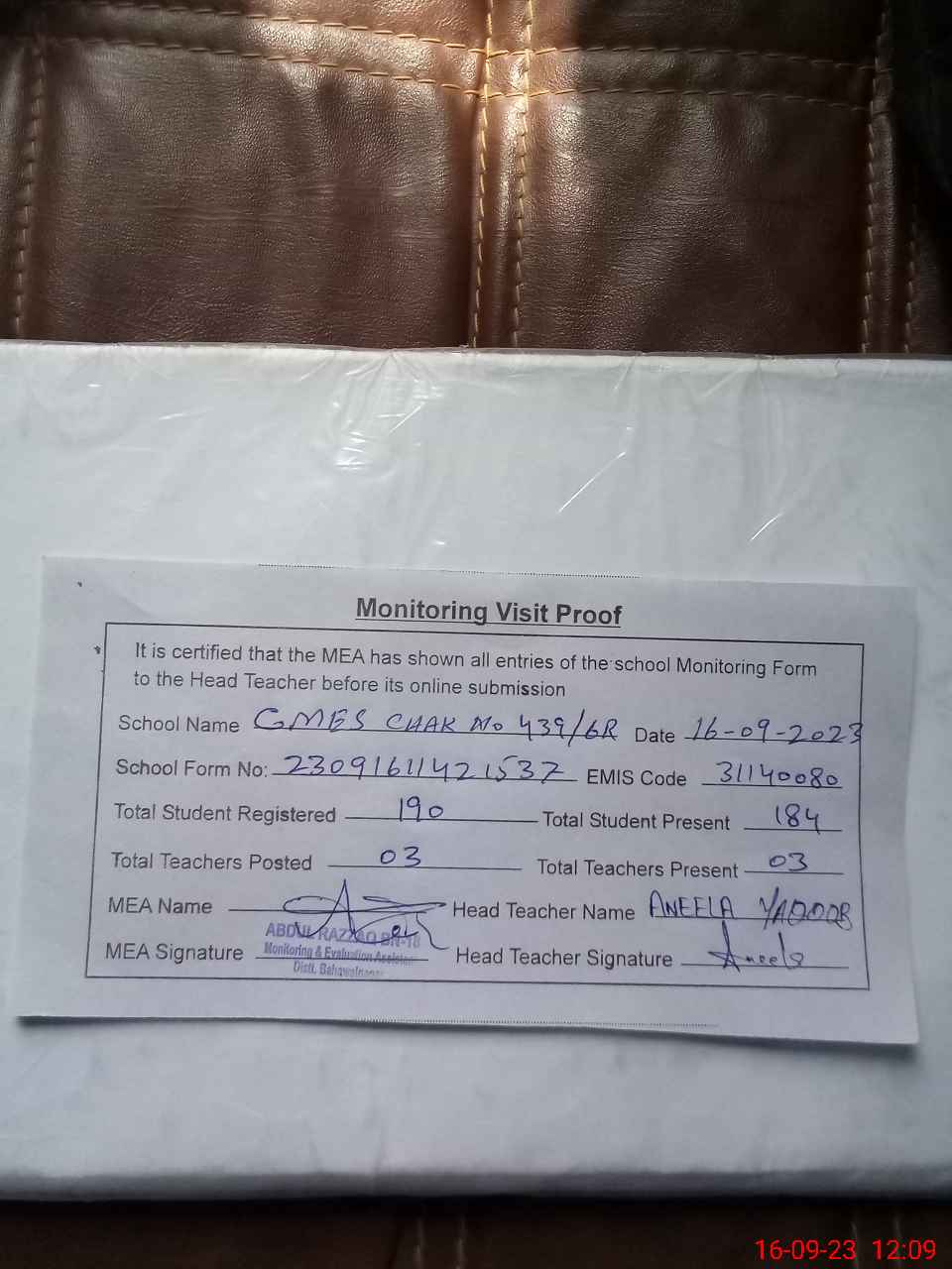 | Attendance Register | Head Teacher | MEA with School | Visit Proof |