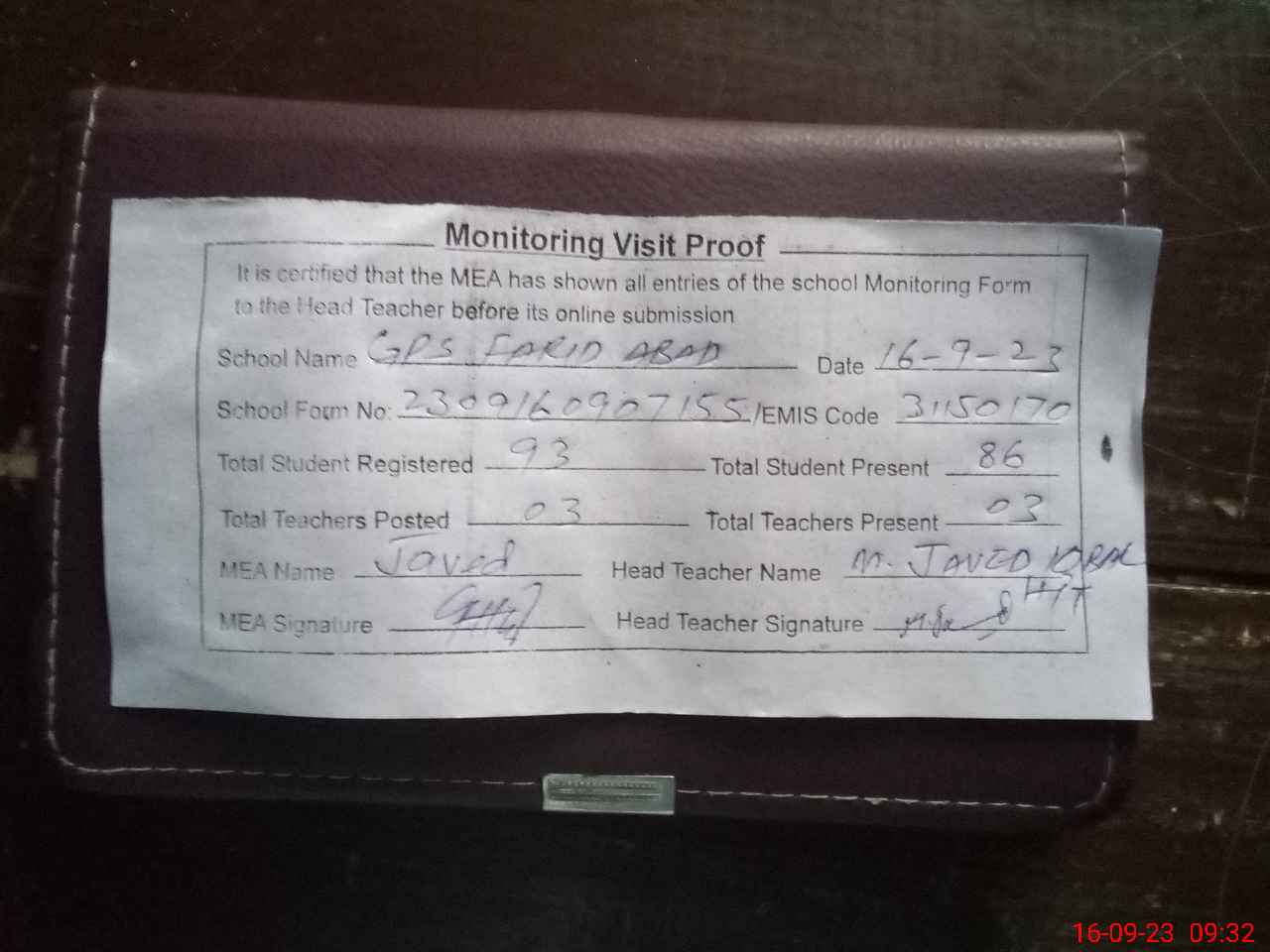 | Attendance Register | Head Teacher | MEA with School | Visit Proof |