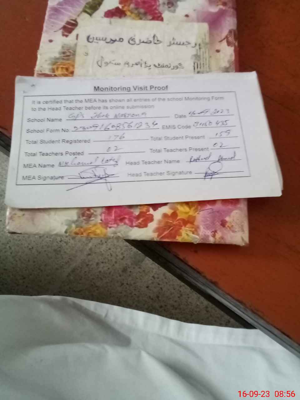 | Attendance Register | Head Teacher | MEA with School | Visit Proof |