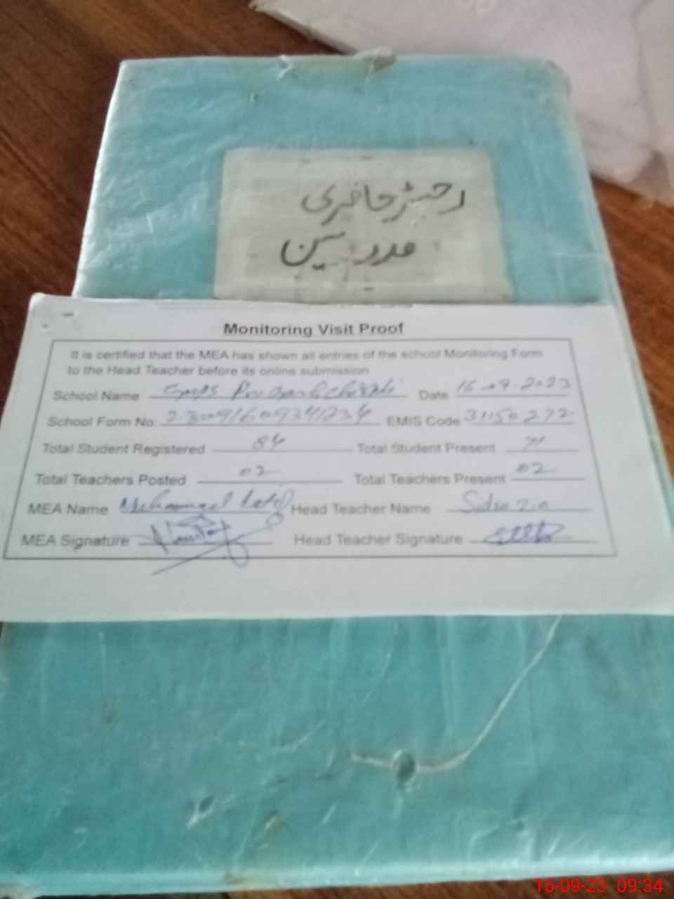 | Attendance Register | Head Teacher | MEA with School | Visit Proof |