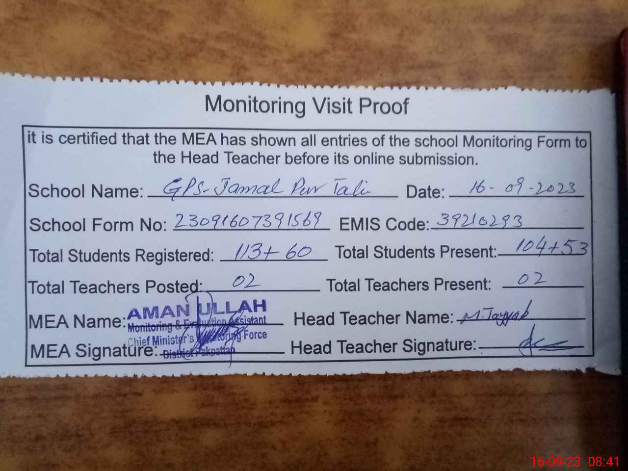 | Attendance Register | Head Teacher | MEA with School | Visit Proof |