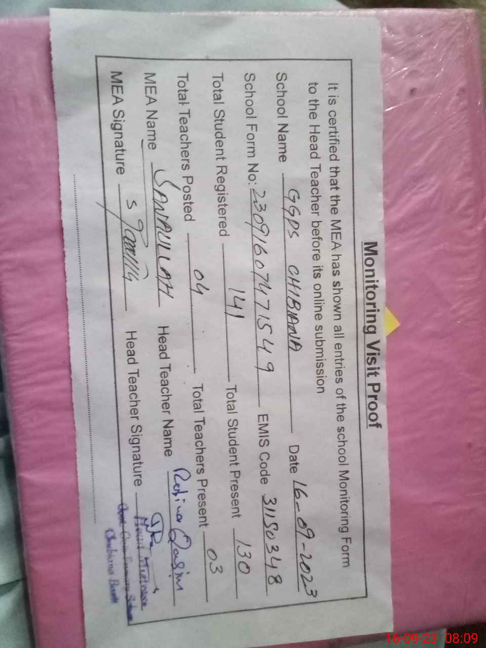 | Attendance Register | Head Teacher | MEA with School | Visit Proof |