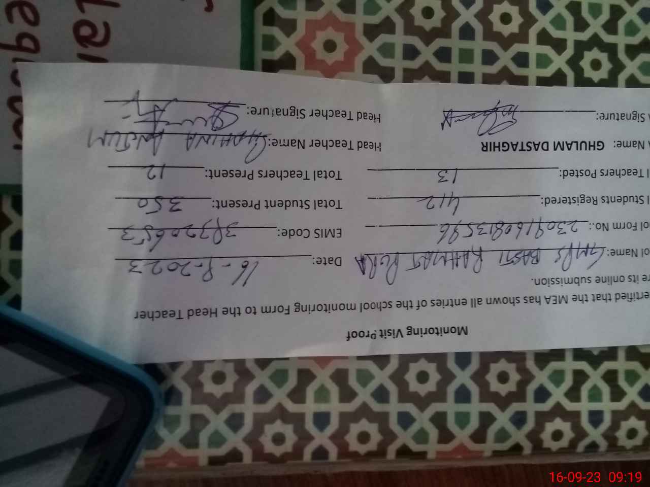 | Name: Sh**** An**** Designation: (School Headmaster's/Headmistress's) PST Phone/Cell Number: 03**** |